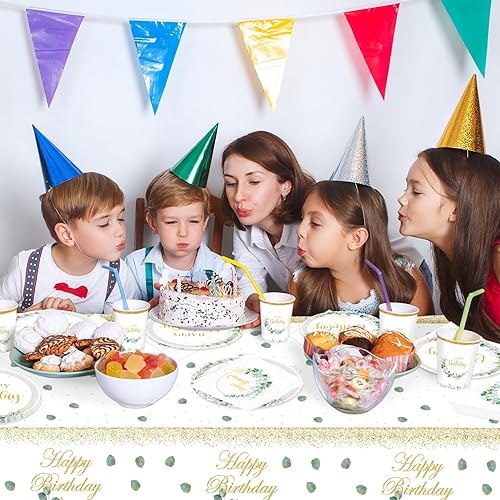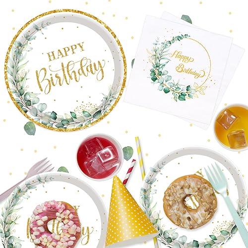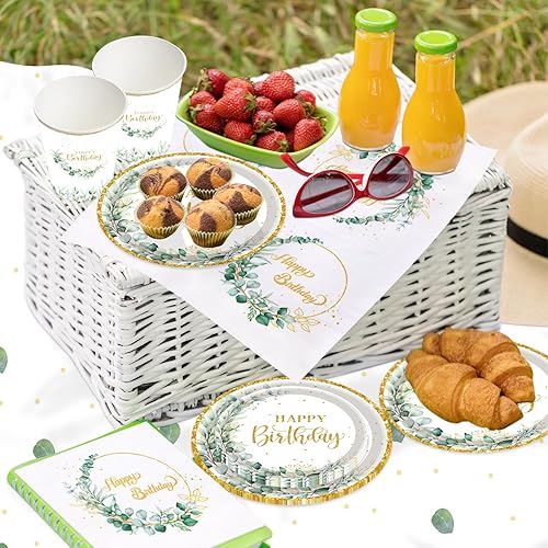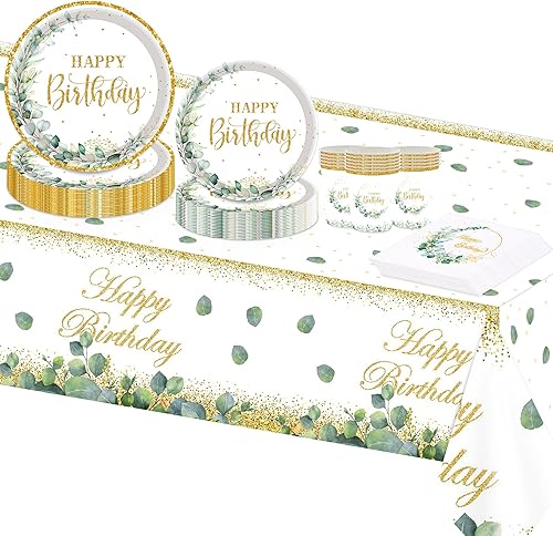 TOPWAYS Sauge Vert Anniversaire Assiette Jetable Decoration, Eucalyptus Papier Assiette Jetable Gobelets Serviette Nappe pour Fête Anniversaire Fille Garçon Femmes Homme Party Decoration(20 Invités)