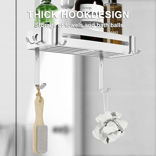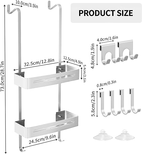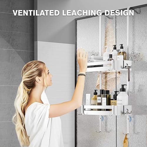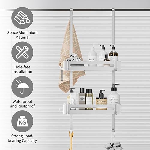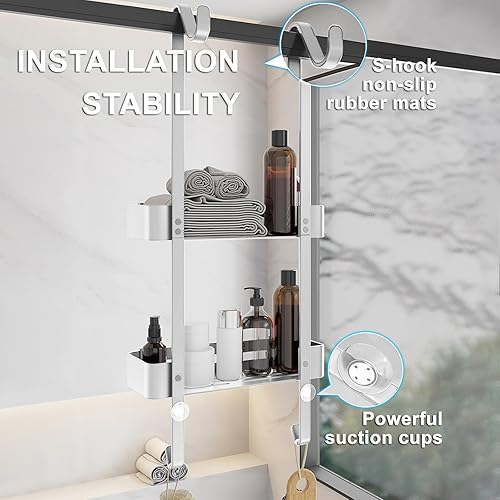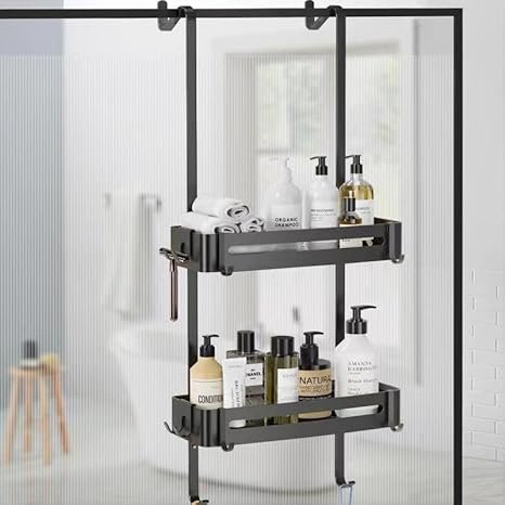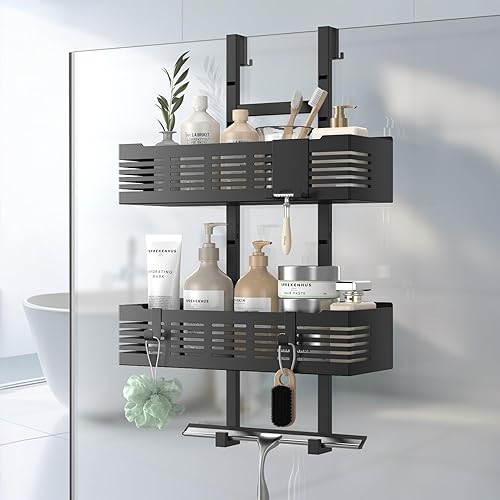 AIGOCITY Étagère de douche à suspendre, sans perçage, noire, pour portes de douche en verre, design réglable en hauteur avec 3 crochets pour ranger le shampooing et le gel douche dans la salle de bain
