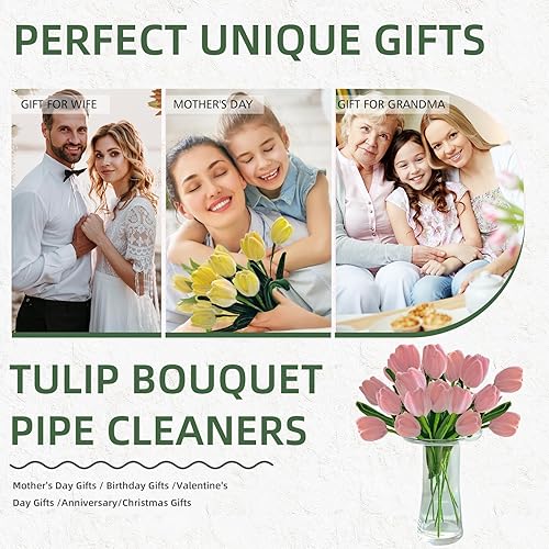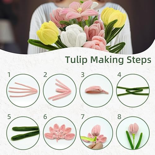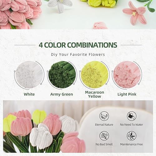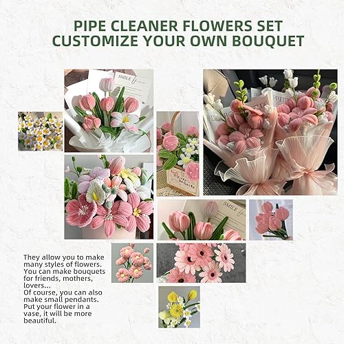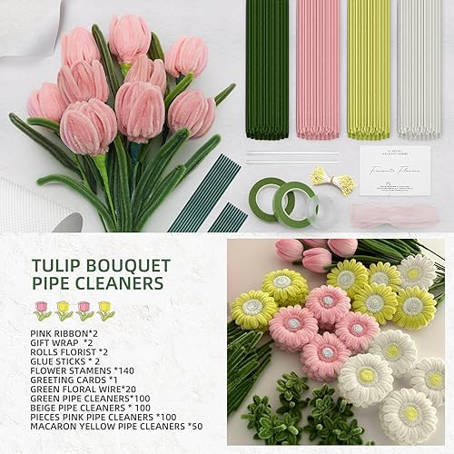 350 Pièces Cure Pipe Chenille,Cure-pipe à Bricoler Set,Dense et Moelleux Fil Chenille,avec Tige Fleur,Ruban,Étamines,papier cadeau,pour Bouquets de Tulipes,DIY et Décoration(Rose)