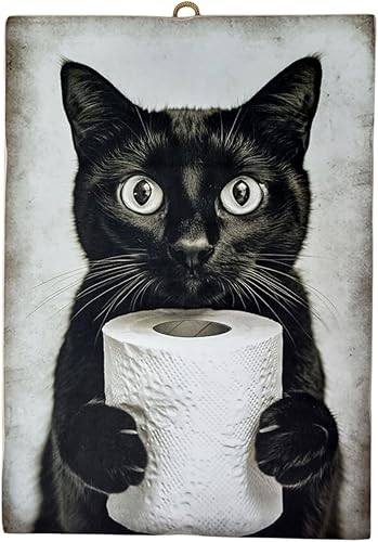 KUSTOM ART Tableau série animaux meuble toilette chat noir avec papier toilette imprimé sur bois 25 x 18 cm