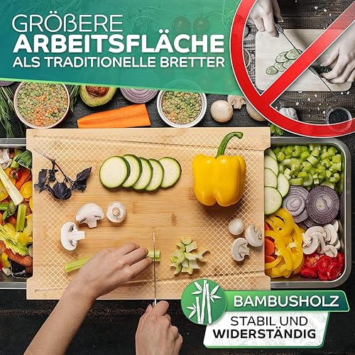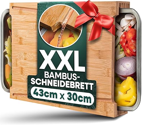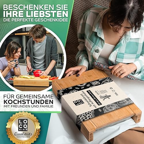 Loco Bird Planche à découper Premium avec plateaux de récupération - Gadget idéal pour la cuisine - Set - Planche à découper en bambou avec 2 plateaux en acier inoxydable