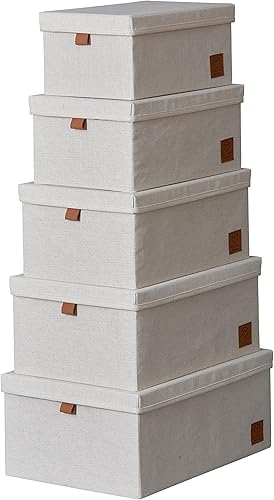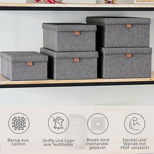 LOVE IT STORE IT - Premium - Boite de rangement avec couvercle, lot de 5 - tissu en lin - poignées en cuir textile - renforts en bois - gris chiné - différentes tailles