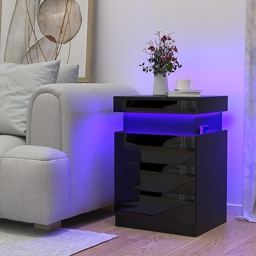 EXSELTMAN Table de Nuit Blanche, Table de Chevet LED, 16 Couleurs LED RVB, Chevet de Lit avec 2 Tiroirs, Conception de la Glissière Supérieure, pour Salon, Chambre, Bureau 45x40x52cm