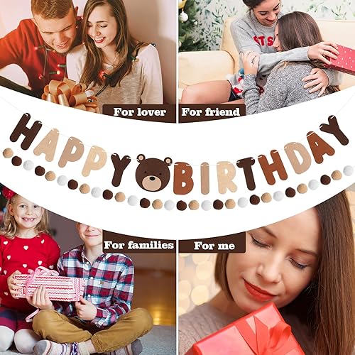 MBAIYO Bannière « Happy Birthday » sur le thème des animaux, kit de décoration d'anniversaire à faire soi-même avec pompons et boules d'ours marron pour décoration de fête