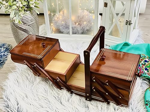 Boîte à Couture en Bois - Gingembre Sculpté 41 cm - Rangement pour Bobines de Fil, Kits de Broderie et Point de Croix - Panier à Couture