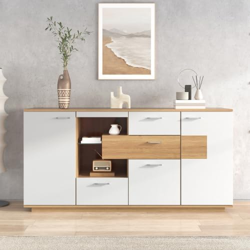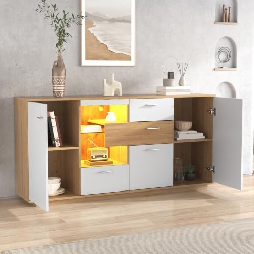 Générique Buffet Bas avec éclairage LED,2 Portes, 4 tiroirs, étagère en Verre,Armoire de Salon Moderne,160x40x77cm,Blanc