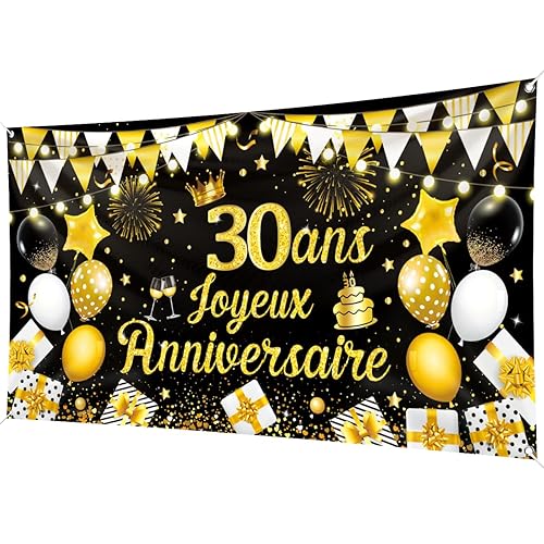 30 Ans Bannière Joyeux Anniversaire Noir Or 200 x 110cm 30 Ans Toile de Fond Joyeux Anniversaire 30 Ans Banderole Joyeux Anniversaire Garcon pour Fête d'Anniversaire