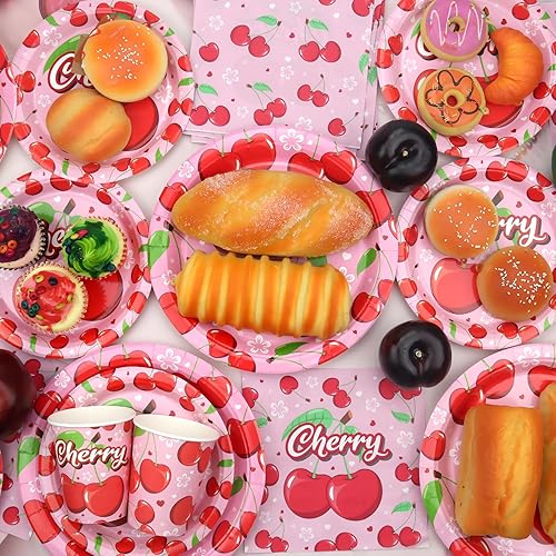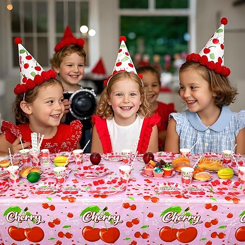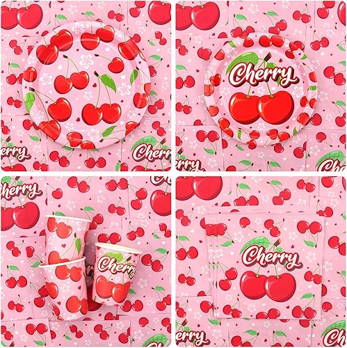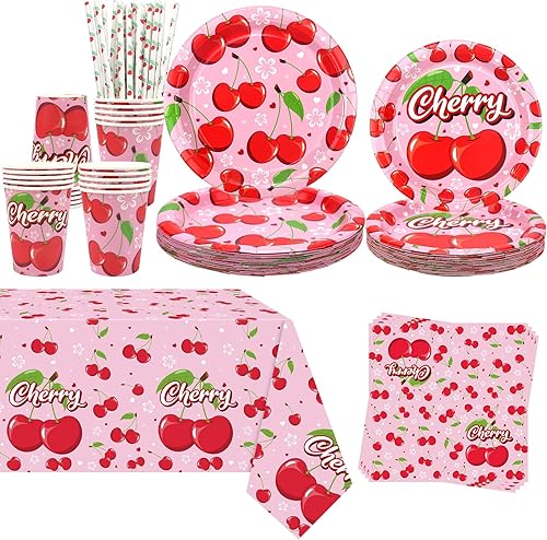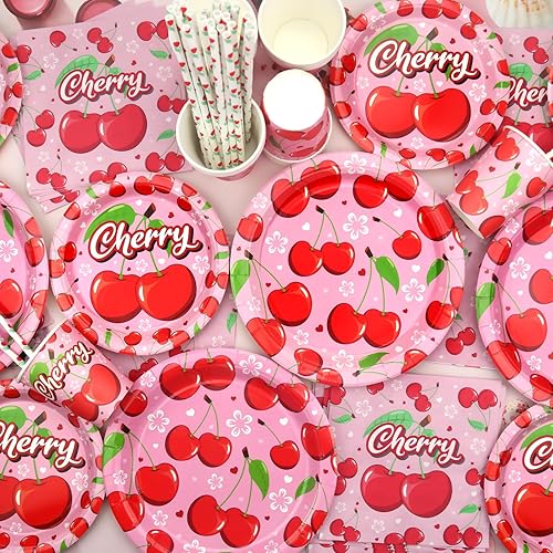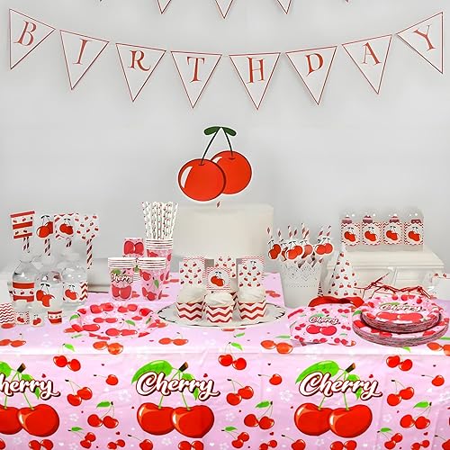 Obussgar Décoration de fête cerise - Vaisselle de fête d'anniversaire cerise comprenant assiettes, tasses, serviettes, nappe, pailles - servie 20
