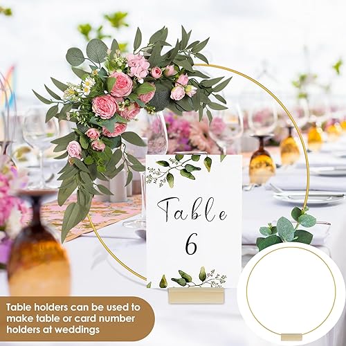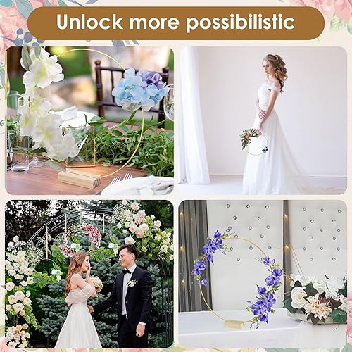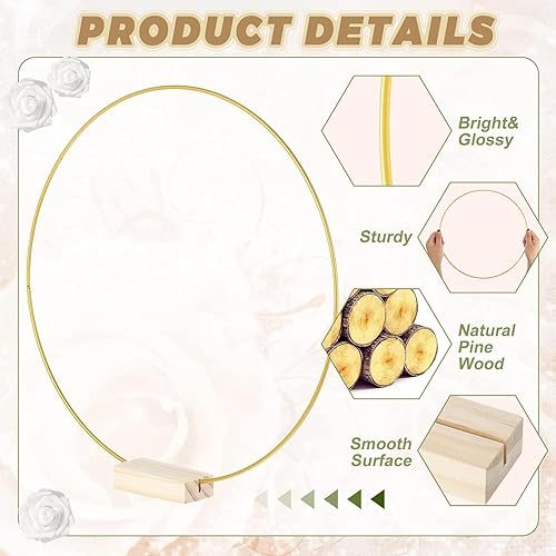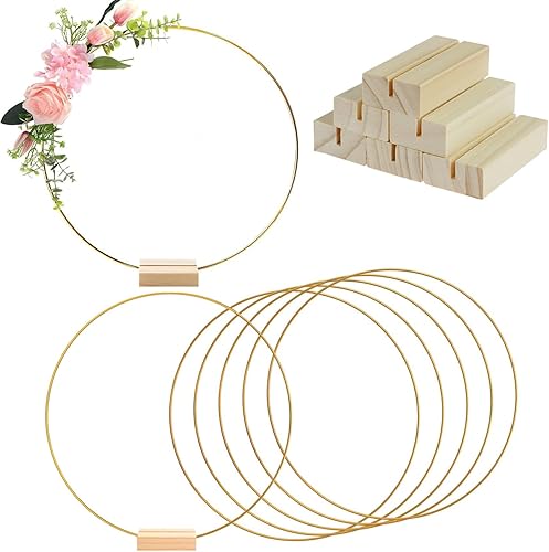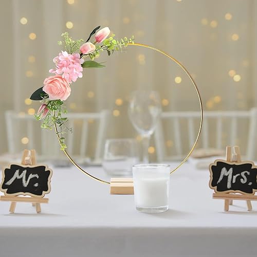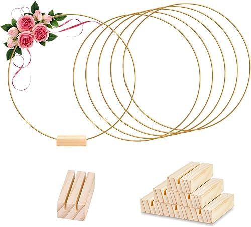 6 Pièces 30cm Cerceaux en Métal doré, Cercle Attrape Reve Cerceau, Cerceaux Floraux en Métal avec Support Bois pour Table, Cercle Metal pour Cerceau Floral DIY, Couronne de Mariage, Guirlande de Noël
