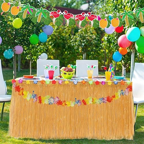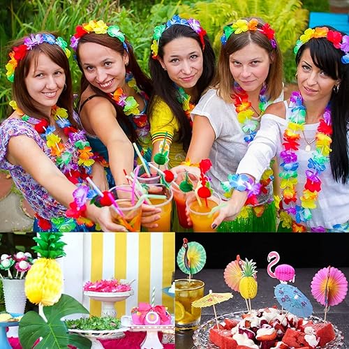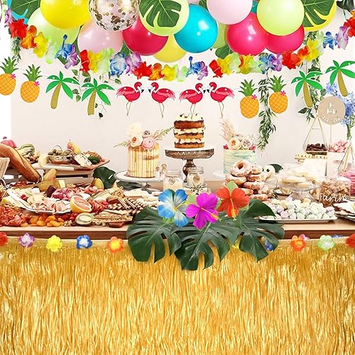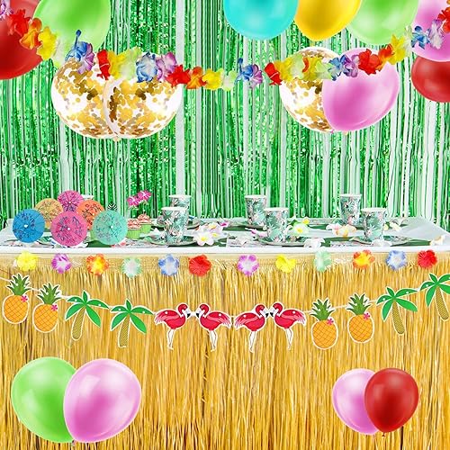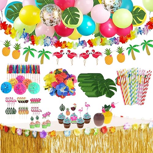147 Hawaïenne Table Jupe Ballon Guirlandes Set Palmier de Simulation Fleurs d'hibiscus en Soie Cocktail Parapluie Pailles de Fruits Fruits 3D pour Beach Summer et Fête à Thème Hawaïenne