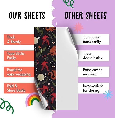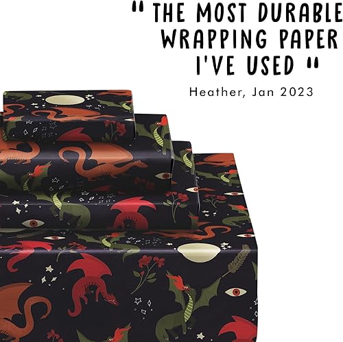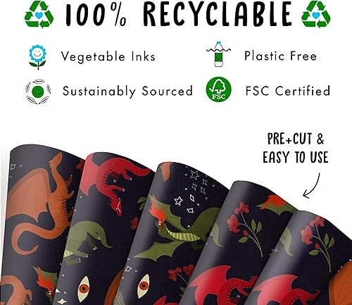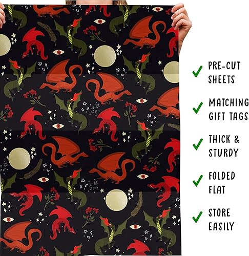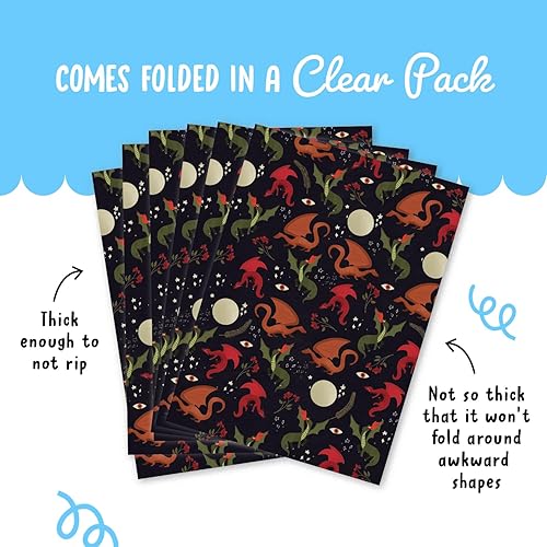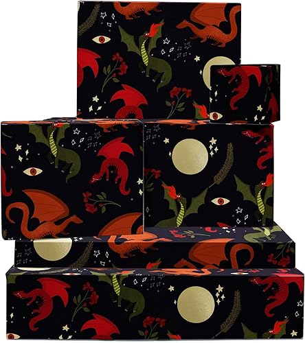Papier cadeau noir – 6 feuilles de papier cadeau d'anniversaire – Dragons – Lune – Étoile – Pour homme et femme – Halloween – Livré avec autocollants – Recyclable – Par Central 23