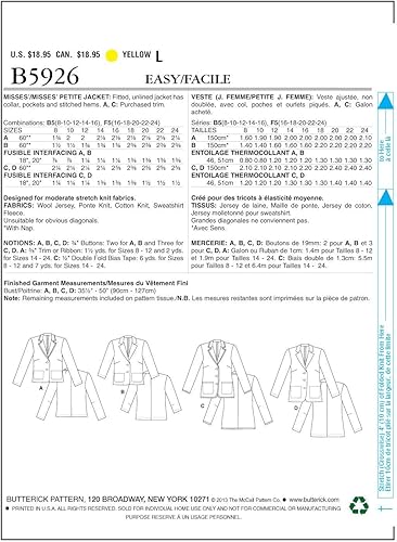 Butterick Patterns B5926 Patron de Veste pour Femme Blanc Tailles B5 36 à 44