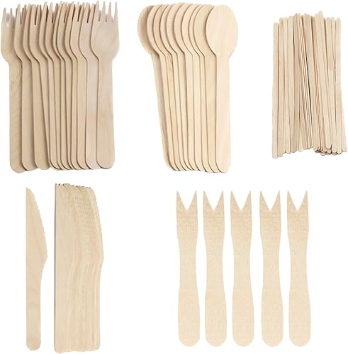 1000 Pièces – Ensemble de Couverts Jetables en Bois, couvert jetable (200 Fourchettes, 200 Couteaux, 200 Cuillères, 200 Mini Fourchettes et 200 Agitateurs (Touillettes) jetables)