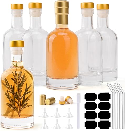 Lot de 6 petites bouteilles en verre de 100 ml avec bouchons en T, mini bouteilles d'alcool avec bouchon en liège, pailles en verre pour liqueur, vodka, vin, whisky, boissons, huile et extrait de