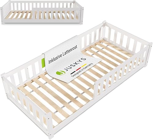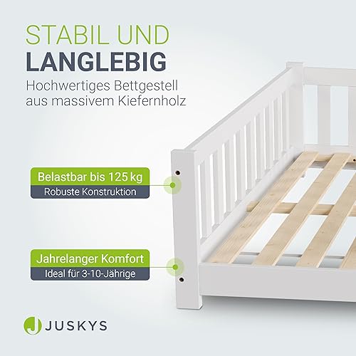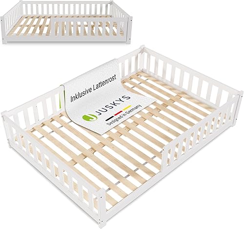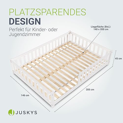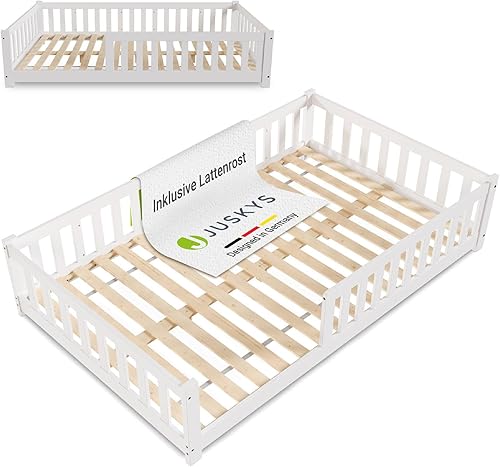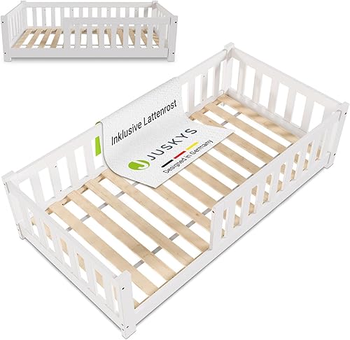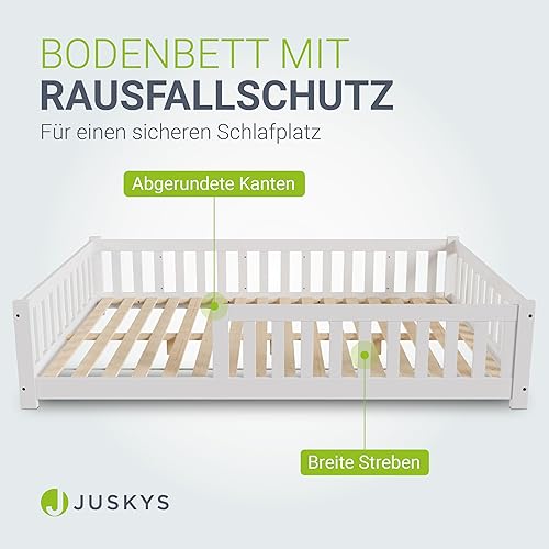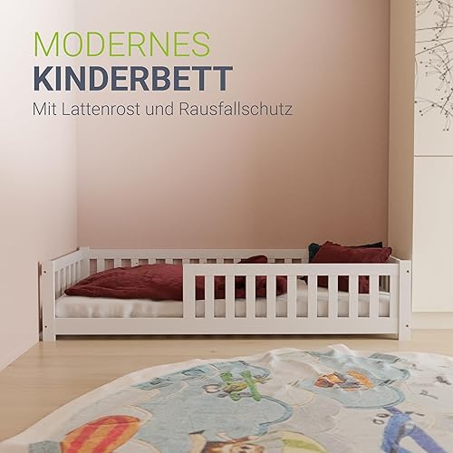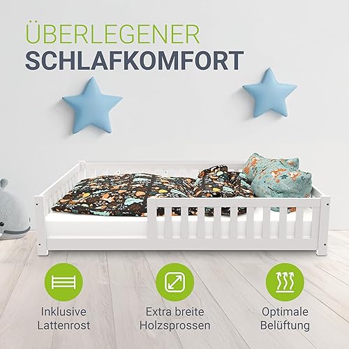 Juskys Lit au Sol Enfant Naya 120x200 cm avec Barrière de Sécurité et Sommier à Lattes, Lit à barreaux Montessori en Bois Massif Pin pour Enfants et Adolescent, Blanc