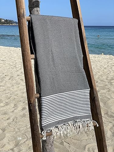 Générique Fouta Tunisienne - Serviette de Plage - 200x200cm Nid d'abeille Rayures Fines Gris Foncé - 100% Coton