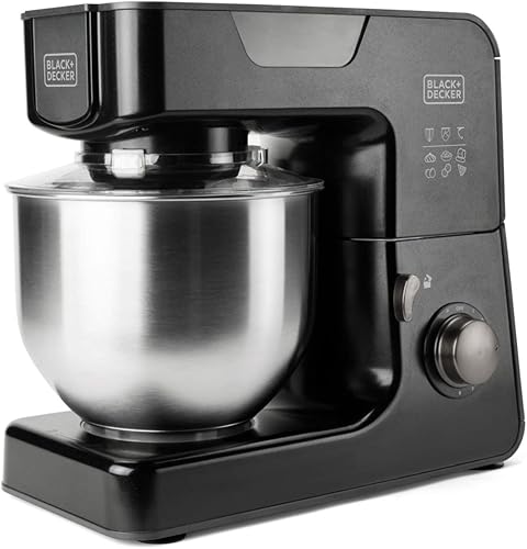 BLACK+DECKER BXKM1000E - Robot Patissier multifonction 1000W, 8 vitesses réglables + Turbo, bol de 5,2L, couvercle anti-éclaboussures, crochet batteur, crochet pétrisseur et crochet mélangeur