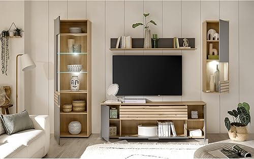 Stella Trading BZ 5110 Vitrine en Gris, Aspect chêne Artisan certifié FSC, vitrine Moderne, avec éclairage LED et Beaucoup d'espace de Rangement, 58 x 199 x 37 cm (l x H x P)