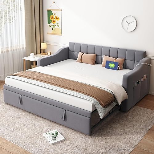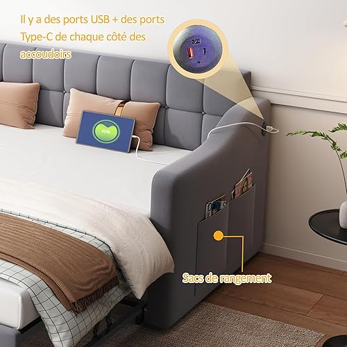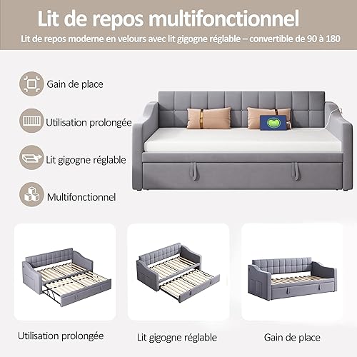 Zubaliya Canapé lit 2 Place 90/180 avec USB et Sac de Rangement, Lit Double Rembourré Extensible 2 en 1 Multifonction avec Gigogne, Cadre de Lit Tissu Velours Gris(sans Matelas)