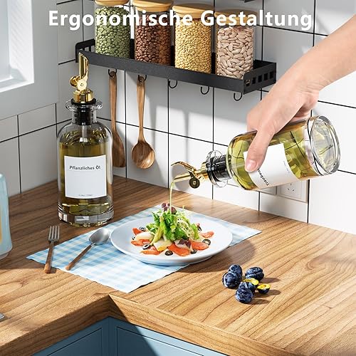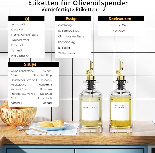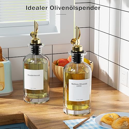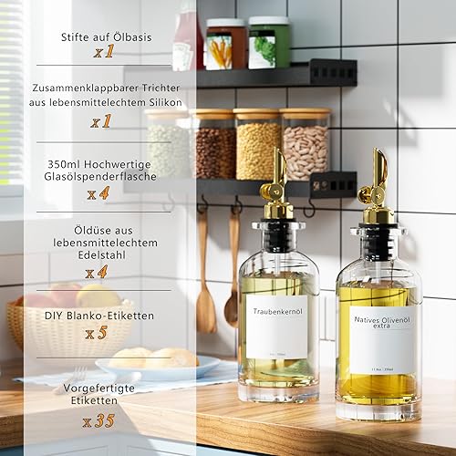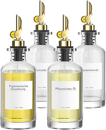 BOLLFO Lot de 4 distributeurs d'huile d'olive, de sirop de café, de vinaigre et de bouteilles d'huile avec bec lesté et 72 étiquettes, 350 ml