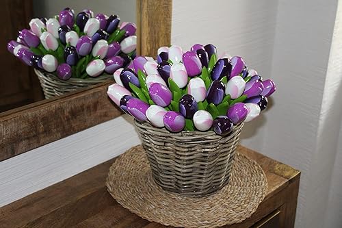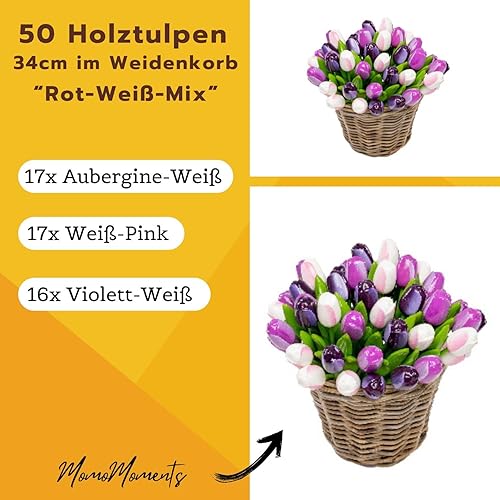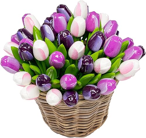 50 Tulipes en Bois dans Un Panier en Osier 34 cm de Haut Bouquet Peint à la Main décoration Fleurs en Bois Cadeau d'anniversaire fabriqué aux Pays-Bas