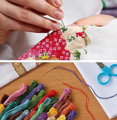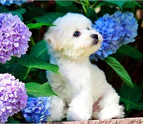 JNNPY broderie point de croix kit complet,canevas point de croix kit complet pour adultes débutant Bichon frisé avec hortensia en fleurs,kit point de croix imprimé pour décoration 40X50cm