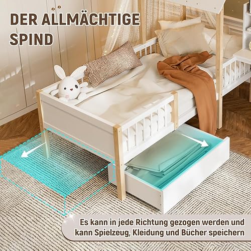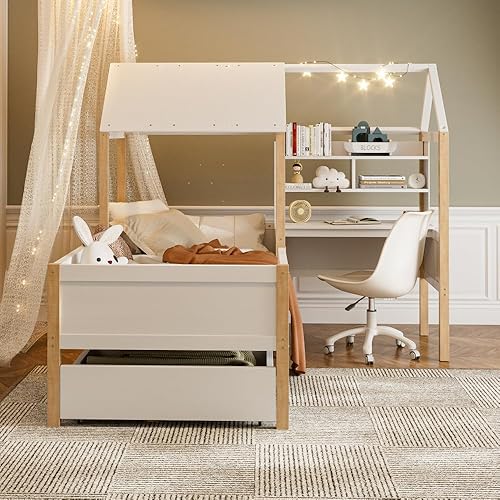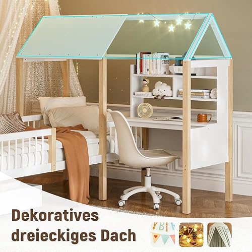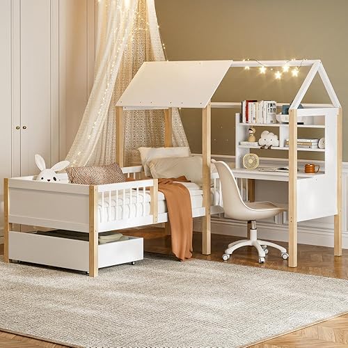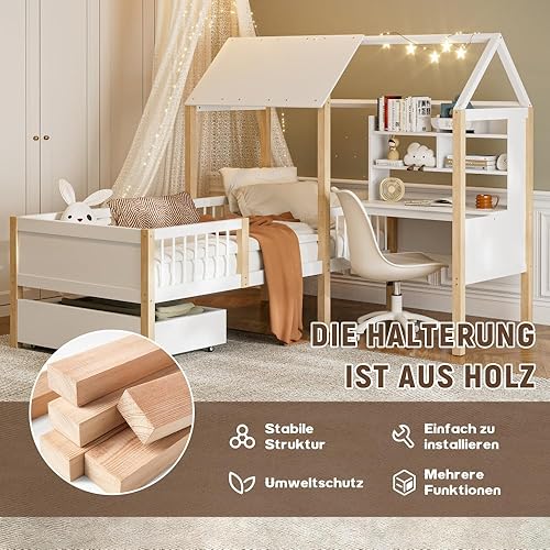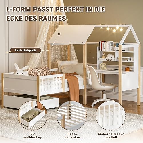 Seyakany Lit cabane Enfant 90x200 cm avec Bureau,lit Enfant cabane tiroirs,lit Enfant avec Rangement et Barriere et sommier à Lattes,Bureau en L et étagère,tiroirs à roulettes,en Bois Massif,Blanc