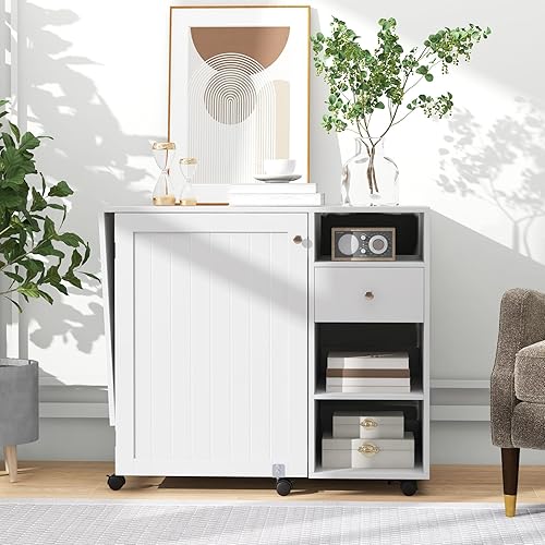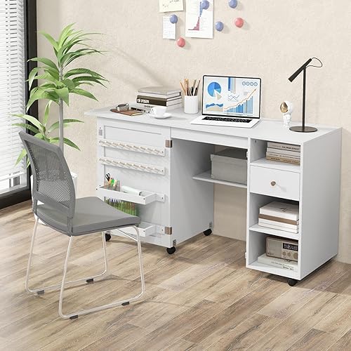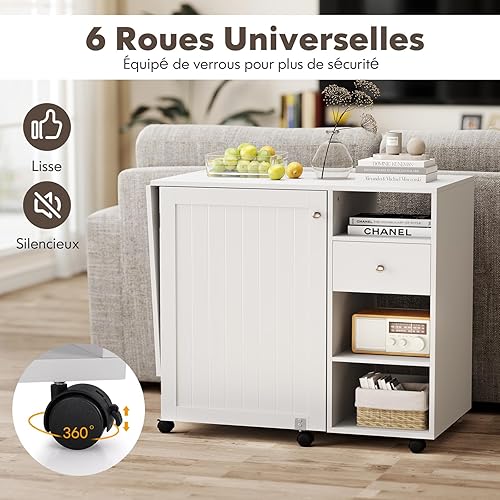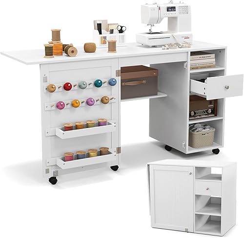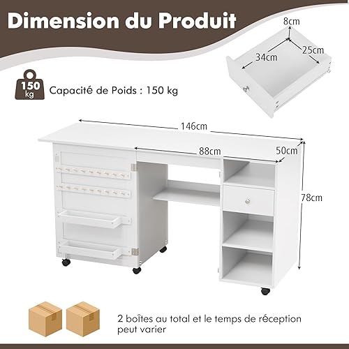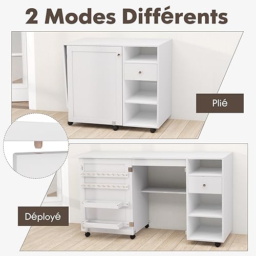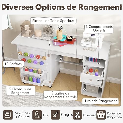GIANTEX Table de Couture Pliante, Armoire à Couture avec 6 roulettes Verrouillables, 3 Étagères, 3 Compartiments Ouverts, 1 Tiroir, 18 Patères, Meuble Machine à Coudre pour Petits Espaces