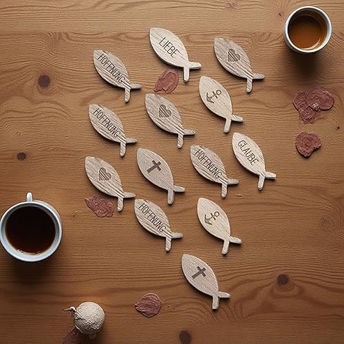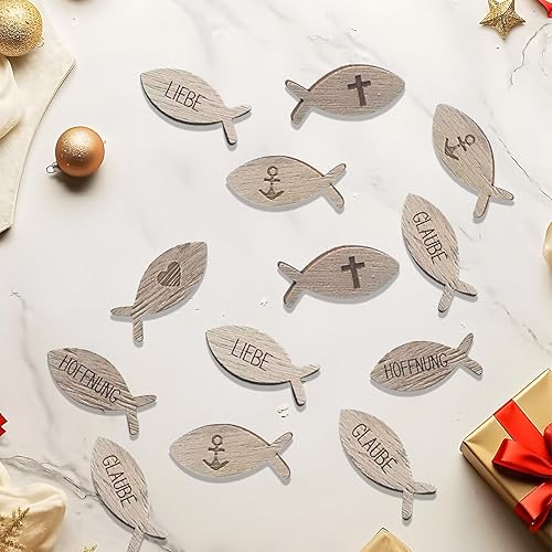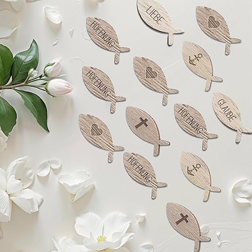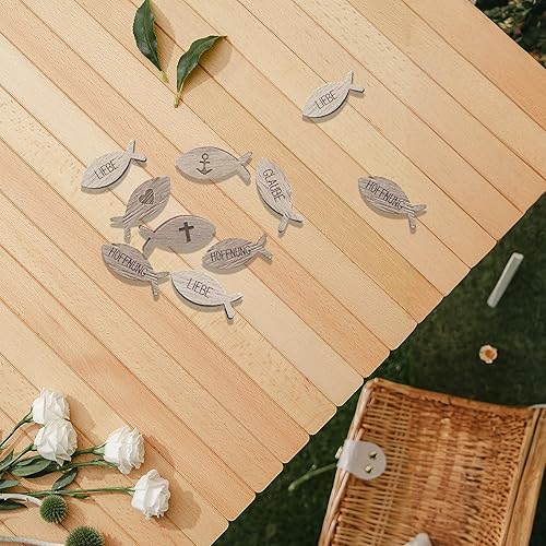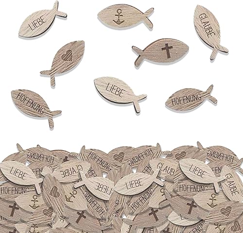 LUMOOM Lot de 100 poissons en bois à disperser pour communion, baptême, décoration de table, première communion et confirmation, pour fille garçon, avec inscription bénédiction, pour fête prénatale (A