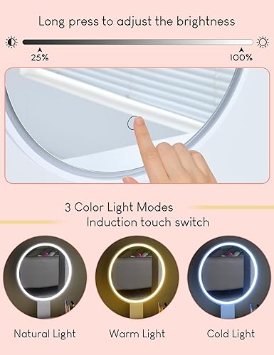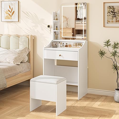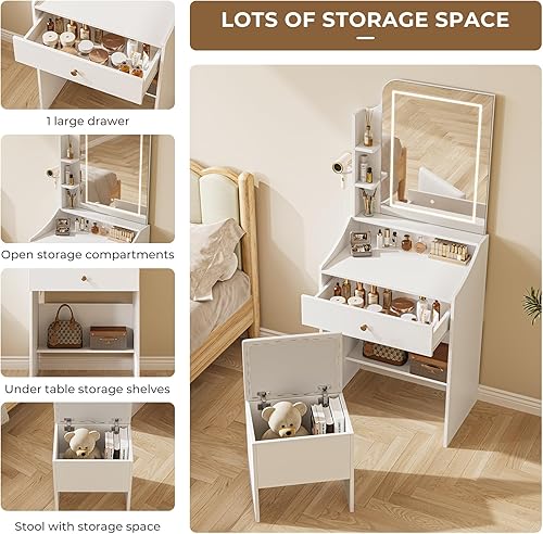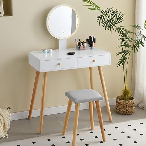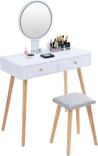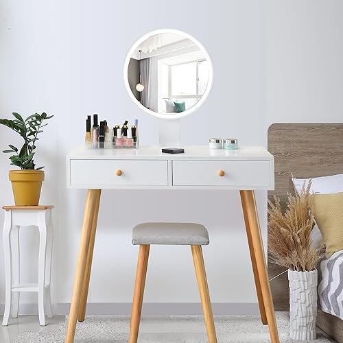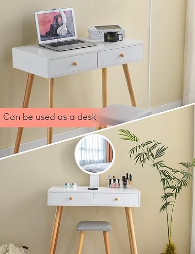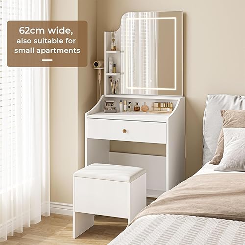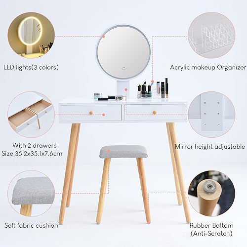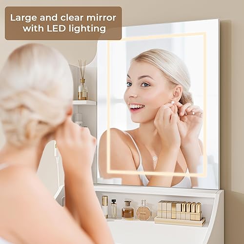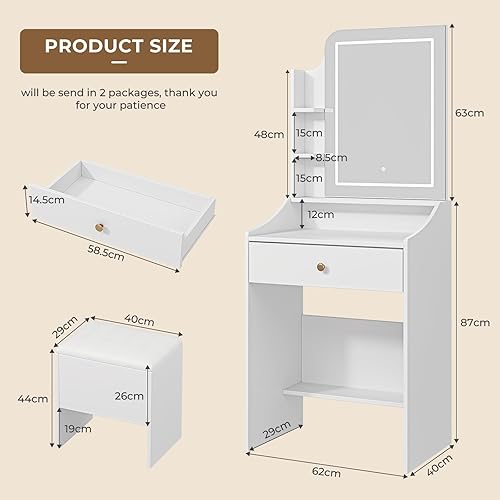 Ezigoo Coiffeuse Blanche en Bois avec Miroir LED et Tabouret – Réglable en Hauteur avec Éclairage à Trois Températures