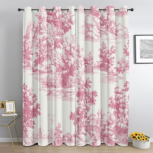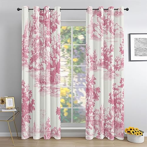 DlaQoryx Rideaux Salon Toile De Jouy Rose, Rideaux Occultant Campagne Française Vintage, 140x260 cm Rideau Thermique Isolant Anti Froid Et Chaleur, Chambre Décoration, Lot De 2