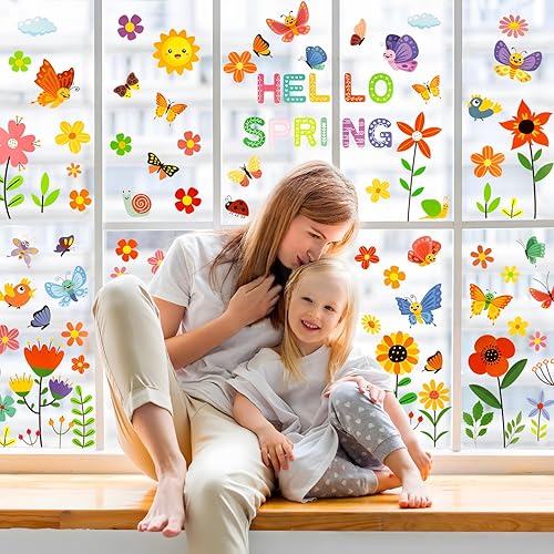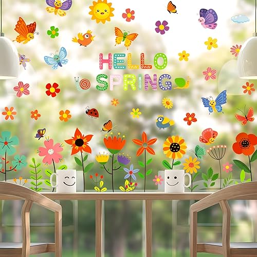 9 Feuilles Autocollants Stickers de Fenêtre Printemps Fleur Papillon Feuille Soleil Auto-Adhésif avec l’Eau Décoration Vitres Fenêtres Réutilisable pour Maison Boutique Fête Mariage Anniversaire