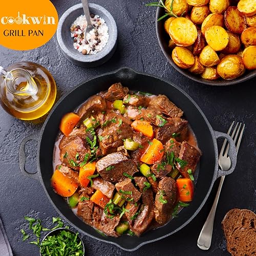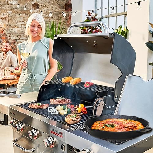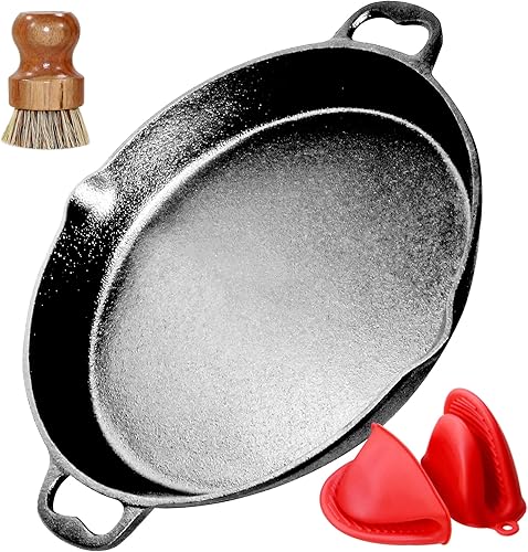 Poêle à paella en fonte pré-saison 35 cm avec deux poignées pour barbecue à gaz, induction, four, grills – 1 brosse PC, 2 poignées en silicone