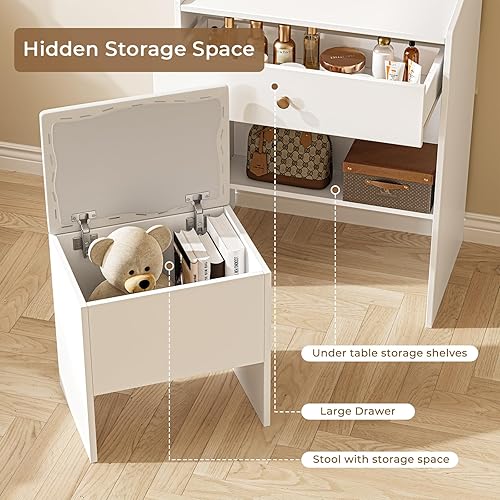 Dripex Coiffeuse Blanc, Table de Maquillage Moderne avec Miroir et Tabouret, 4 Tiroirs, Confortable Tabouret 87 x 40 x 144CM (87x40x144 cm)