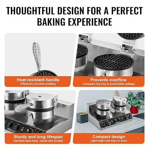 VEVOR Gaufrier Commercial 2460 W, Appareil à Gaufre Ronde à Double Tête, en Acier Inoxydable, Antiadhésif, avec Contrôle de la Température et du Temps, pour Restaurant Boulangerie Snack Bar Famille
