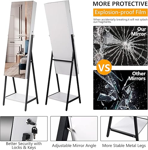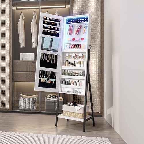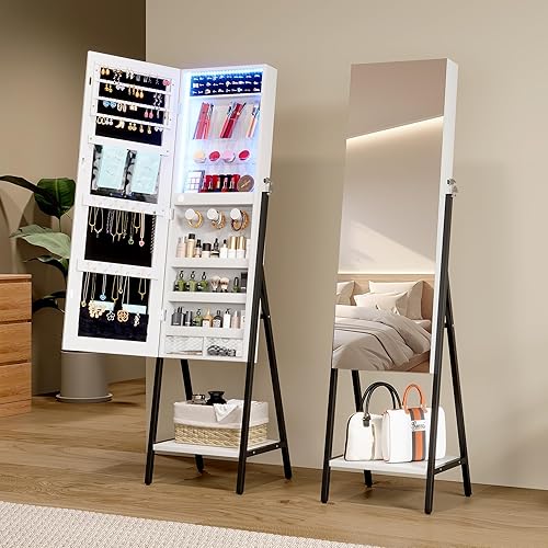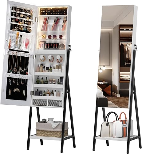 LVSOMT Armoire à Bijoux sur Pied avec LED, Armoire a bijoux avec Miroir Pleine Longueur, Armoire bijoux miroir avec étagères, Miroir bijoux avec Grand espace de stockage pour Chambre Vestiaire, Blanc