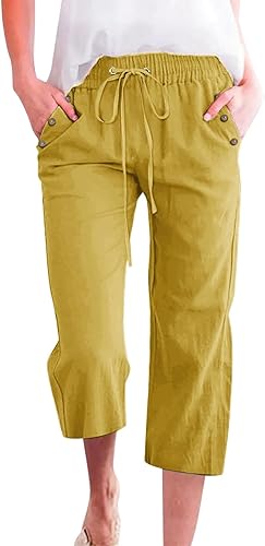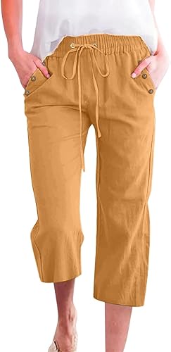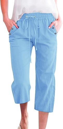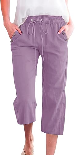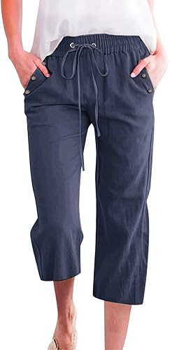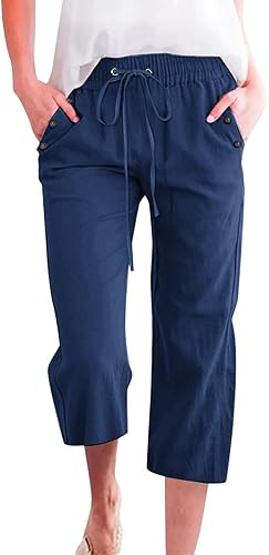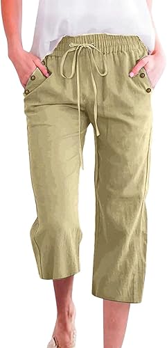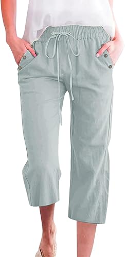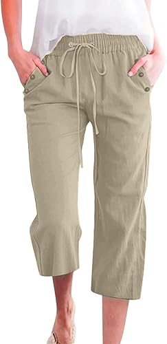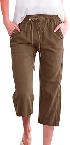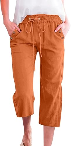 2025 Pantalon 7/8 uni en lin mélangé pour femme Coupe ample Pantalon de loisirs avec poches Pantalon cargo pour femme