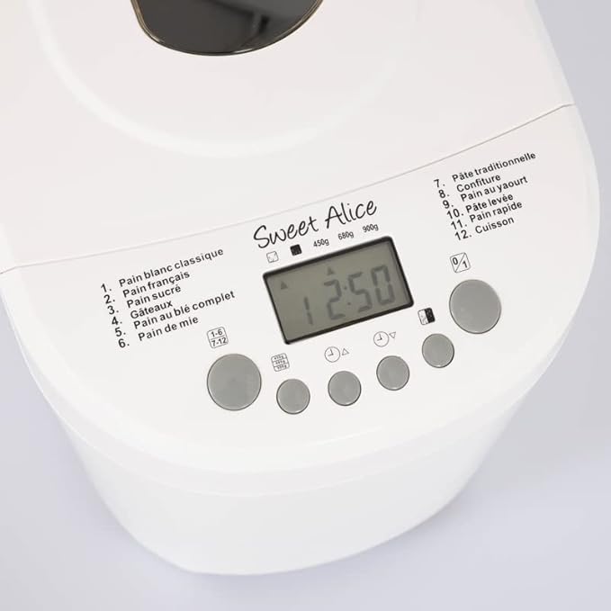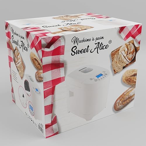 SWEET ALICE - Machine à pain - 12 programmes - Sans gluten - Départ Différé (minuterie 13h) - Maintien au chaud (1H) - 600W - 450g / 680g / 900g - Brunissement - Pâte - Gâteau - Confiture - Blanc