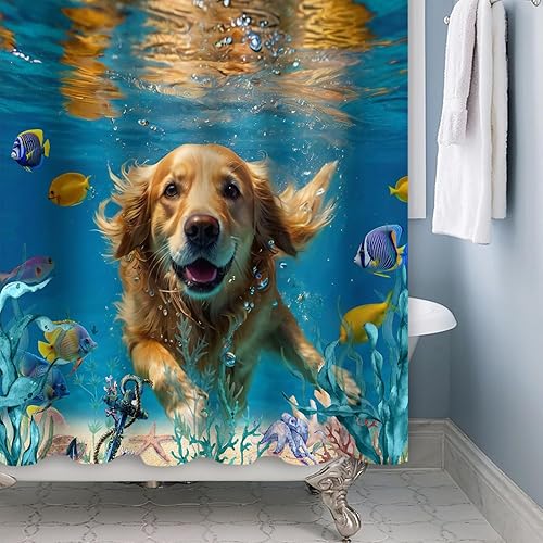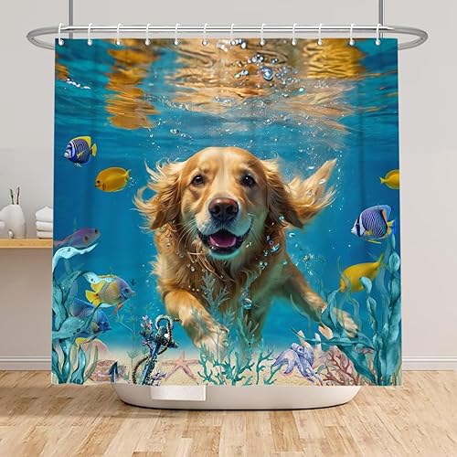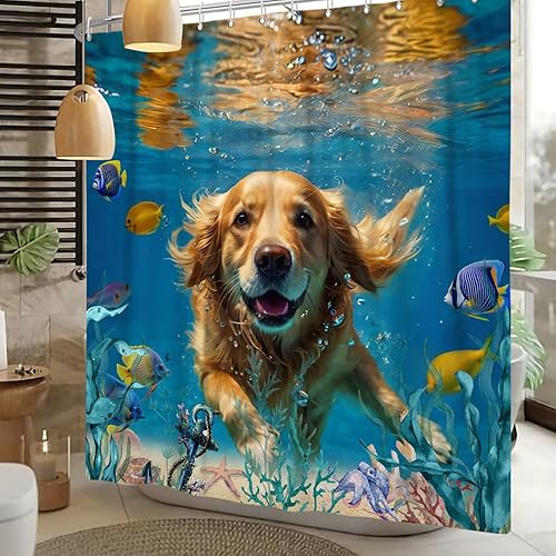 ASDCXZ Rideau de douche chien 180 x 200 cm, drôle chien heureux nager monde sous-marin multicolore océan poisson lavable rideau de douche polyester textile imperméable pour baignoire avec 12 crochets