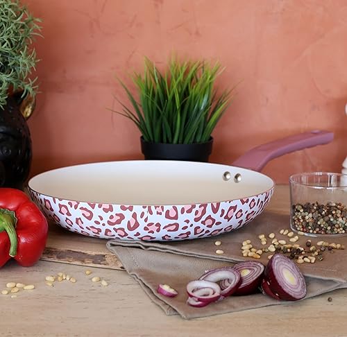 MENASTYL - Poêle Léopard Rose 28cm tous feux dont induction - Revêtement antiadhésif - Aluminium recyclé - Poignée effet bois ergonomique - Motif Léopard - 6020962