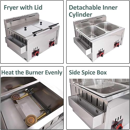 DJXLMN Friteuse à gaz commerciale en acier inoxydable pour frites – Friteuse à double comptoir GPL avec paniers amovibles, puissance de feu réglable, parfaite pour les restaurants et les cuisines à