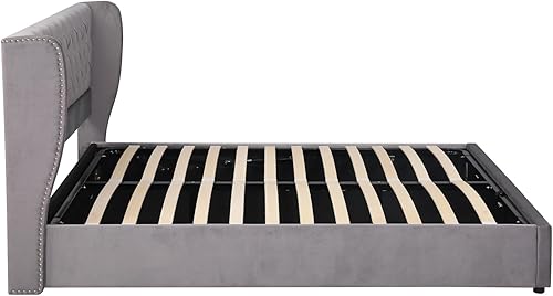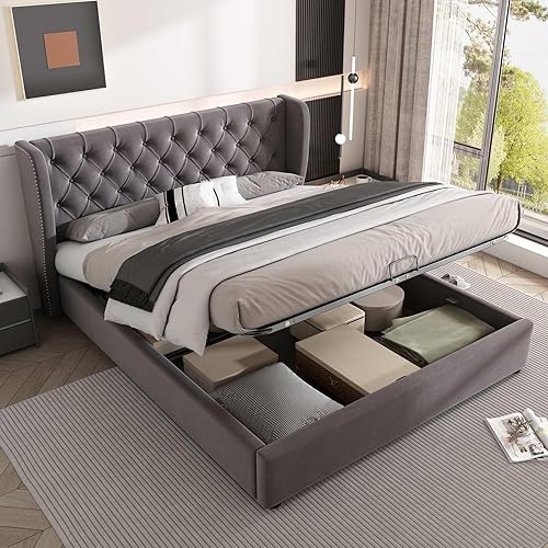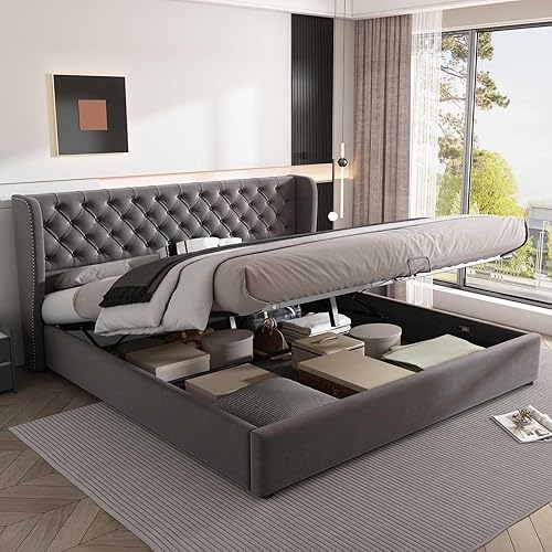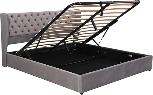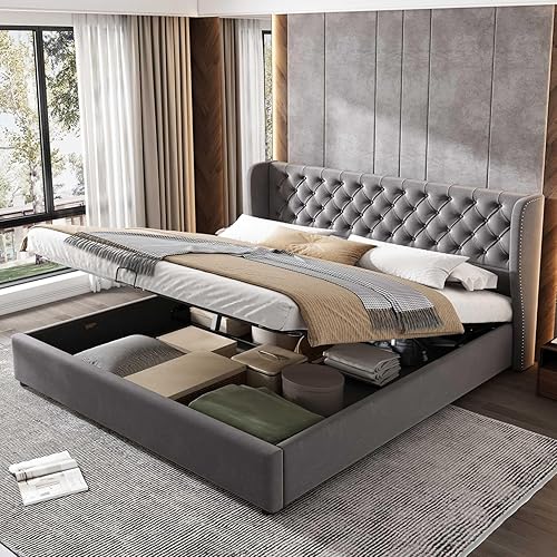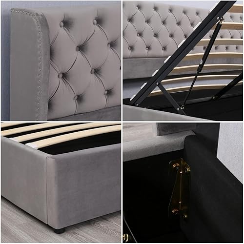 KOMHTOM Rembourré Lit Coffre avec Rangement sous Lit et Tête, Cadre de lit avec Sommier à Lattes (sans Matelas) (Beige, 160x200cm)