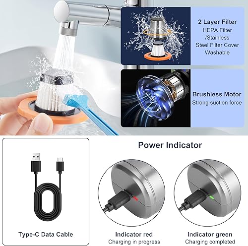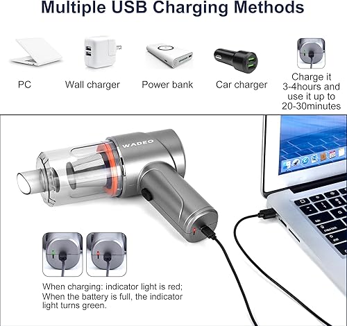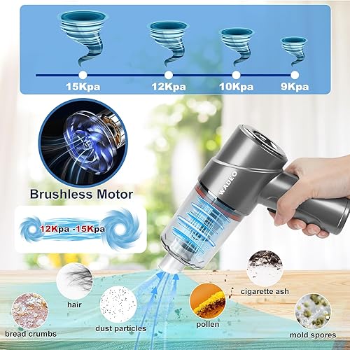 WADEO 15000PA Mini Aspirateur à Main sans Fil, 3 in 1 Aspirateur de Voiture avec Moteur Brushless et Filtre en Acier Inoxydable, Aspirateur Portable Humide-Sec pour Voiture, Maison, Bureau