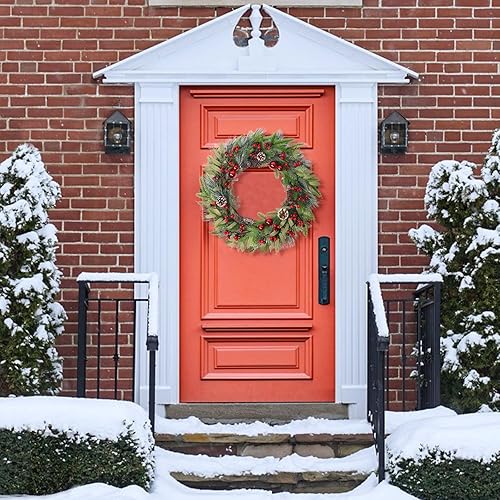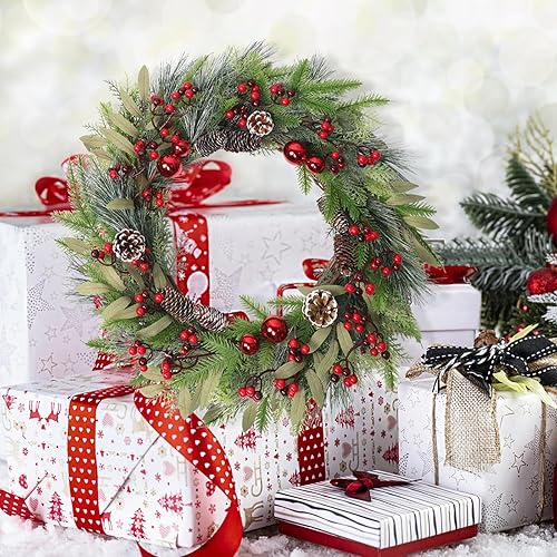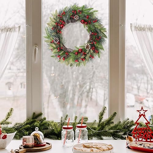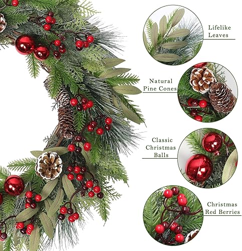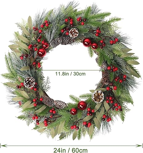 Weldomcor Grande couronne de Noël artificielle de 61 cm pour décoration de porte d'entrée, pommes de pin, aiguilles, baies, boule rouge, guirlande de Noël, festival, intérieur et extérieur, décoration