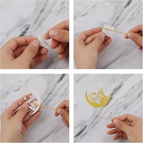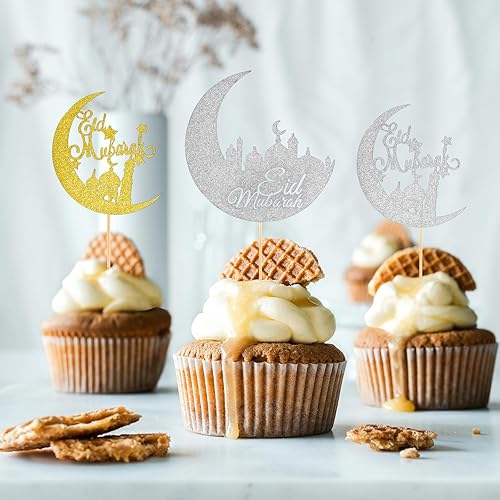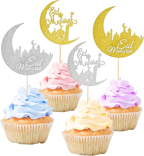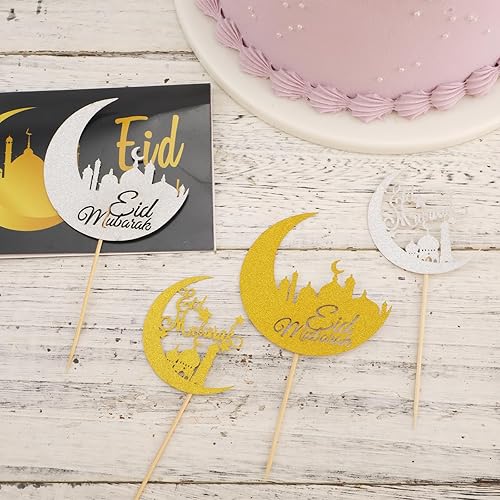 24 Pièces Décorations de Cupcakes Eid Mubarak, Paillettes Or Argent Lune Pics à Cupcakes Kareem Décoration de Gâteau pour Islamique Musulman Anniversaire Fête à Thème Cadeaux Fournitures