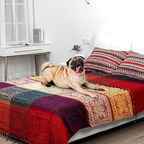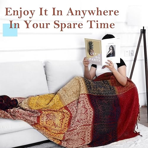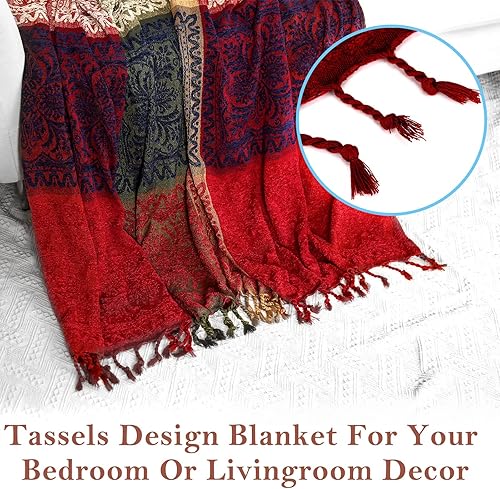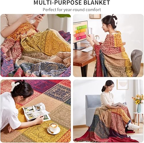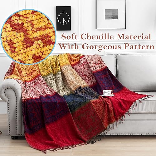 DECMAY Couverture en Chenille Jacquard bohème avec Pompons, jeté pour canapé 2, 3, 4 Places, couvertures Tartan et jetés pour Couvre-Lits, fauteuils, Meubles, jeté de lit (Jaune Bleu, 220 x 260 cm)