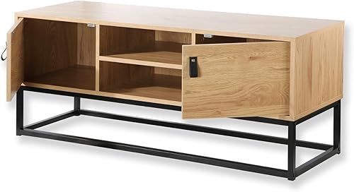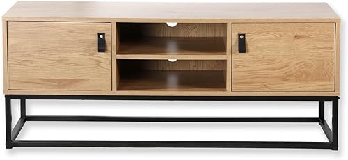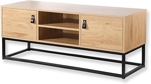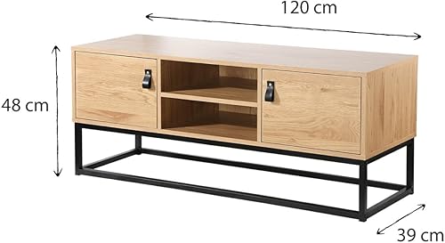 Calicosy - Meuble TV 2 Portes 2 Niches - Décor Chêne Veiné - Panneaux De Particules - Structure en Métal - 4 Espaces De Rangement - Salon Ou Chambre - Style Industriel - L 120 x P 39 x H 48 cm