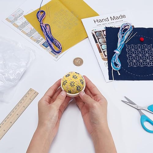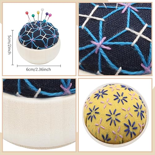 WEBEEDY 2 Sets Bricolage Kit Coussin à Epingles Sashiko Base en Bois Coussin à Epingles pour Couture Sashiko Fil et Aiguilles Kit de Broderie Main Style Japonais Porte-aiguilles(Bleu,Jaune)