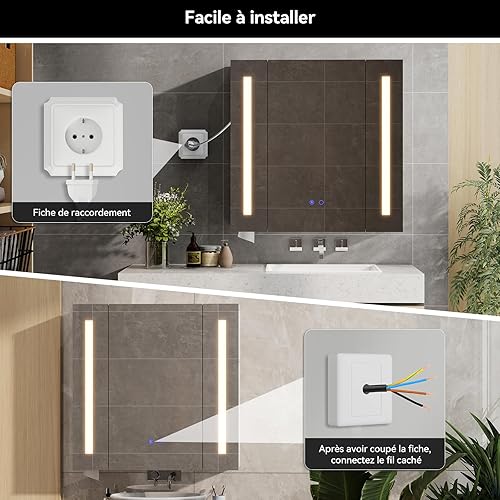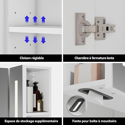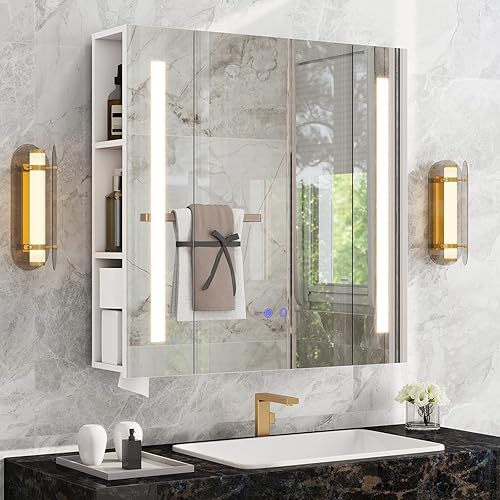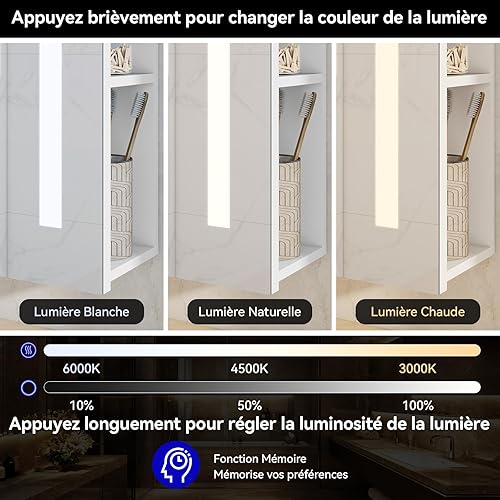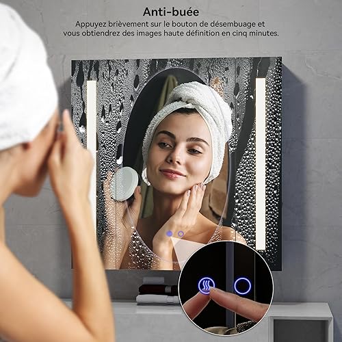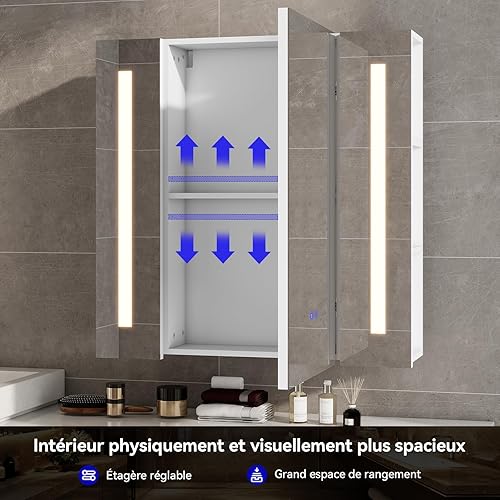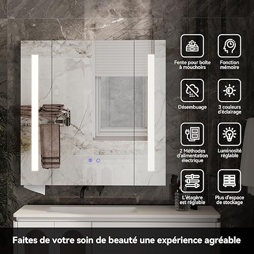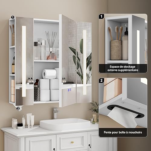 YU YUSING Armoire Rangement Murale de Salle de Bain avec Miroir LED 70x16x70cm, Armoire de Toilette WC Suspendue avec Etagère Réglable et Porte, Anti-buée, 3 Couleurs Dimmable, Bois MDF, Blanc