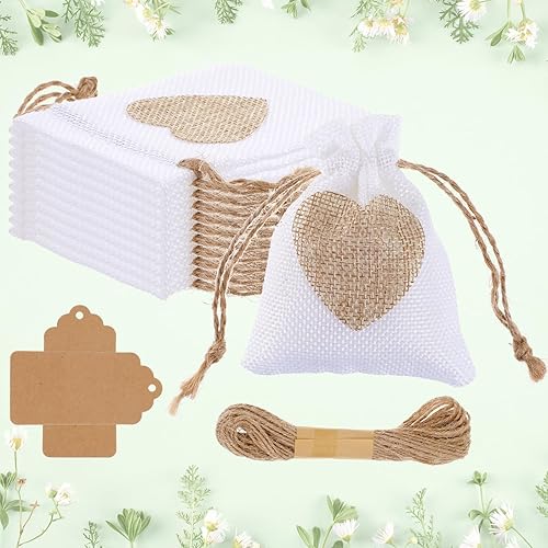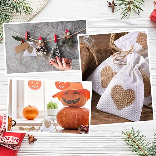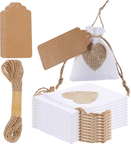 Lot de 10 petits sacs à cordon de serrage 10 x 8 cm en toile de jute avec cordon de serrage, étiquettes et ficelle, réutilisables pour mariage, fête, bijoux, Noël, café, loisirs créatifs (blanc)